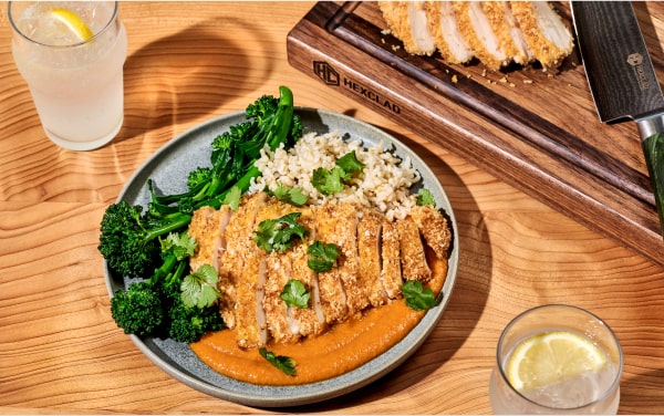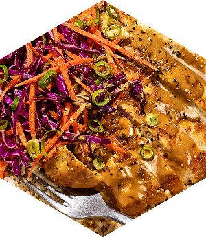 Peanut butter isn’t just for breakfast. Here, it dazzles in an Asian-inspired dressing for chicken along with honey, curry powder, ginger and lime. Sour, sweet, creamy and spicy – honestly, no notes. You can use a mandoline for the slaw or take the opportunity to sharpen up those knife skills.