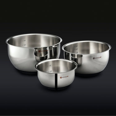 Our signature mixing bowl set gives you an edge in food prep and storage. A much-needed upgrade of a kitchen essential, our stainless steel bowls feature a non-slip silicone base, so they stay put while you’re mixing, blending, and beating—even at an angle.
