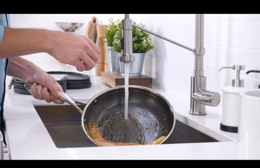 Since our pans are hybrid pans and contain stainless steel, temporary staining can occur. For tougher stains, allow your pans to soak in warm soapy water for 10-15 minutes followed by a scrub with a sponge.