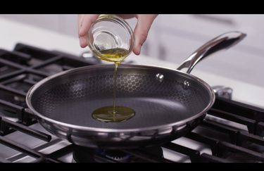 Heat pan to medium-low heat. Spread 1 teaspoon of vegetable oil around the interior of the pan. Leave on heat for 2-3 minutes. Now you're ready to cook! Over the first few weeks of use, your HexClad Hybrid cookware will perform better as it re-seasons itself on its own from the fats in the food you are cooking.